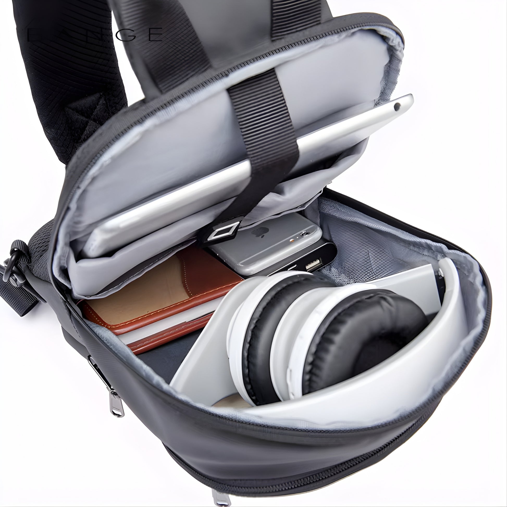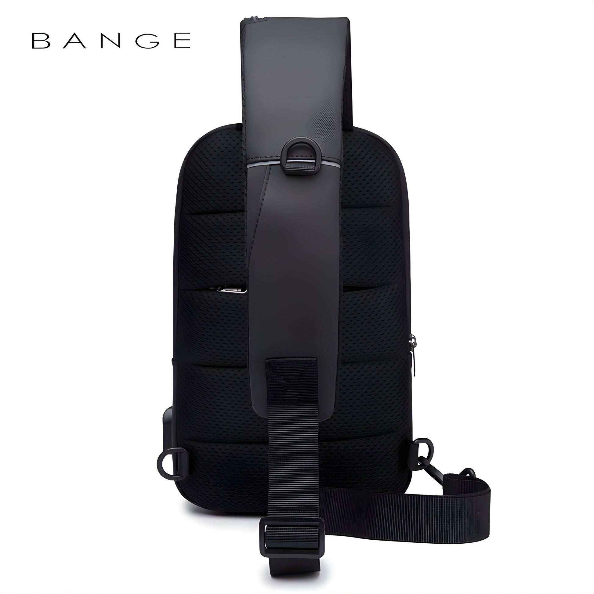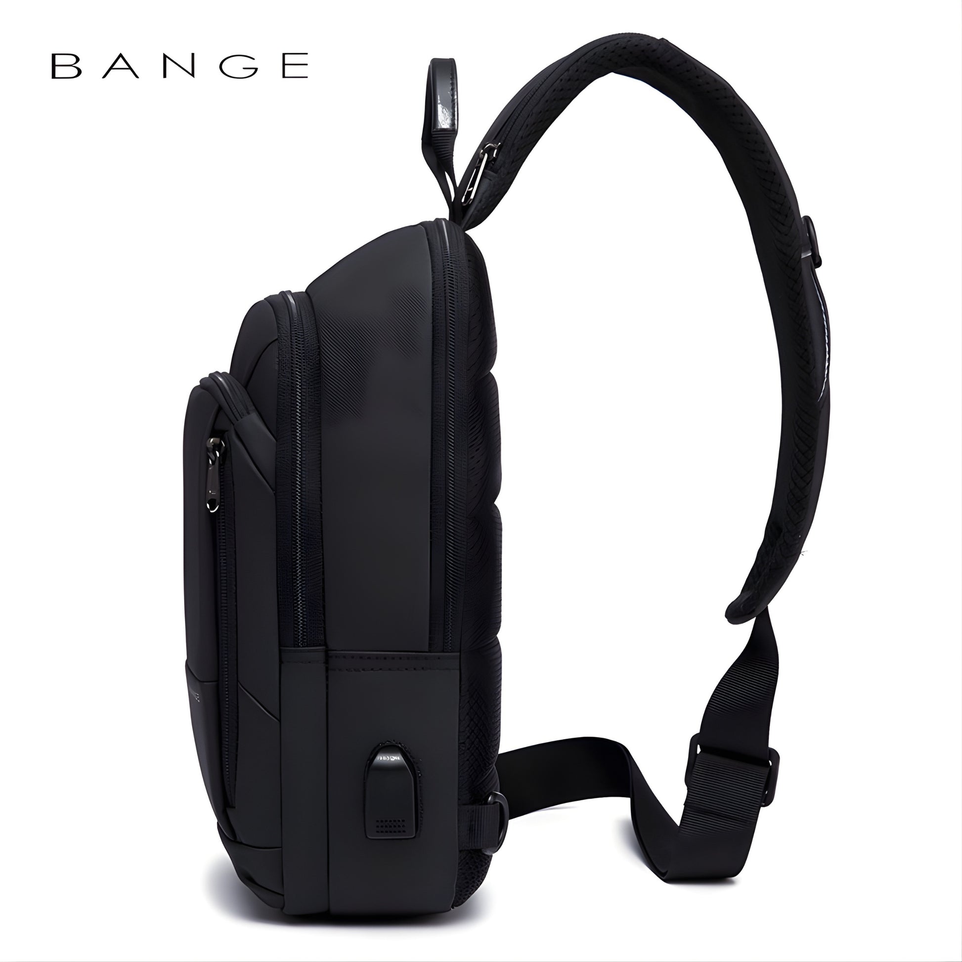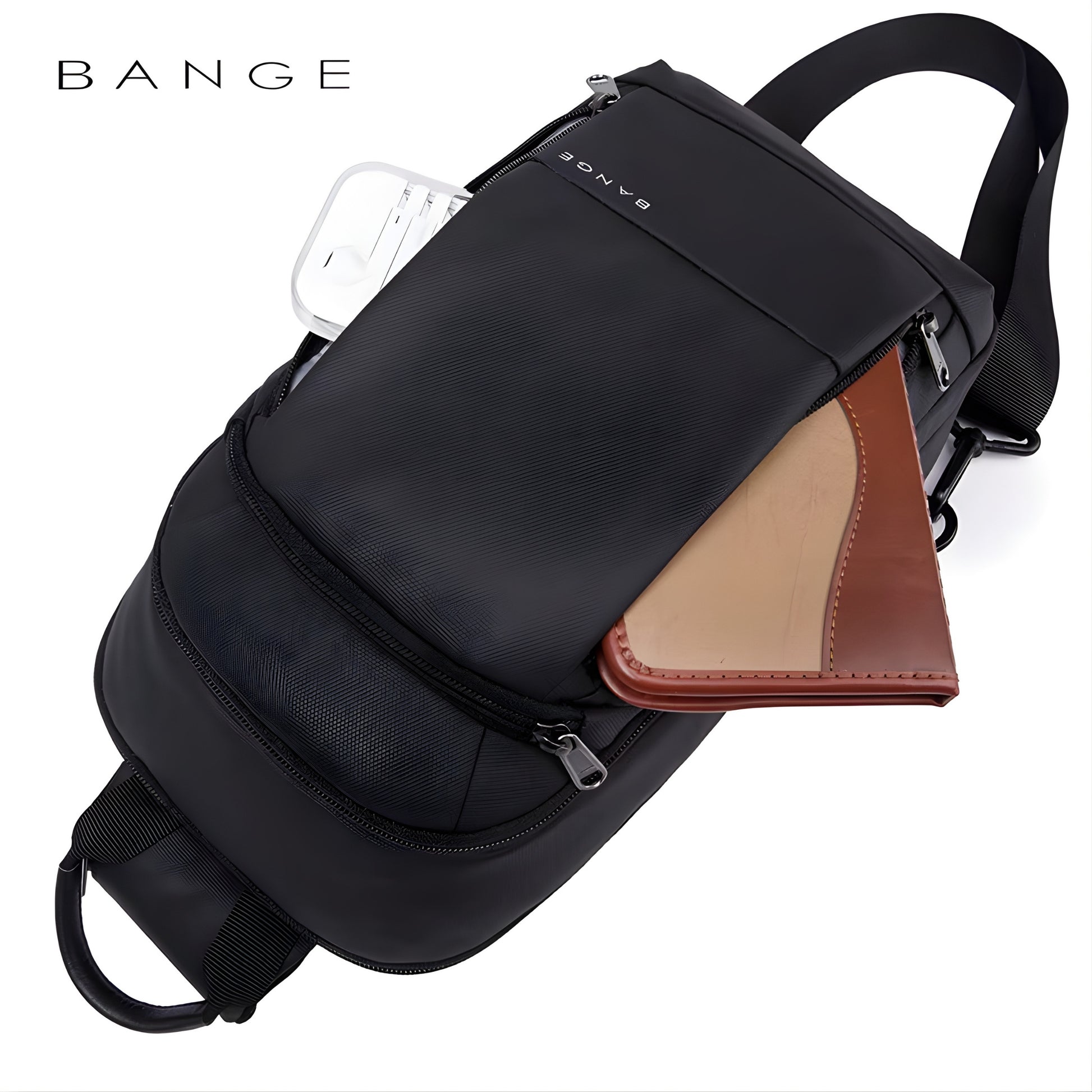 BANGE black anti-theft sling bag with multiple zippered compartments and padded shoulder strap